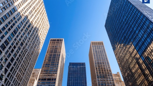 City skyscrapers, sunny day, low angle view, urban scene, business background