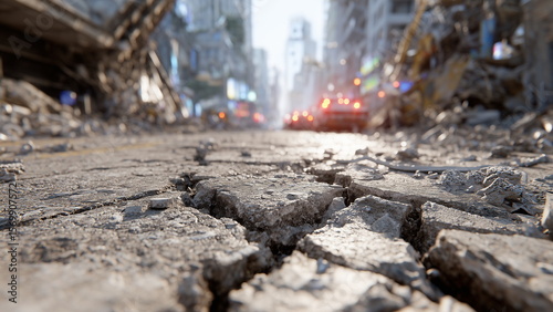 City street after a powerful earthquake, cracked pavement, collapsed buildings with exposed rebar and rubble, dust in the air, emergency vehicles in the distance, tense and chaotic atmosphere.