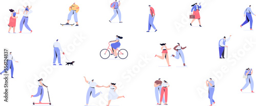 City street, park. Different people silhouettes walking outdoor, riding bicycle, sitting on bench, walking with friends. Crowd illustration
