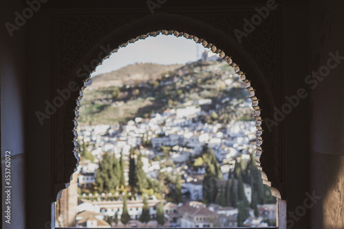 City viewed through an arabesque shaped window. Shadows and light. Arab architecture