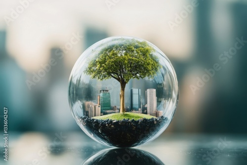 Cityscape and tree inside a glass sphere with reflection on a blurred background in a studio shot