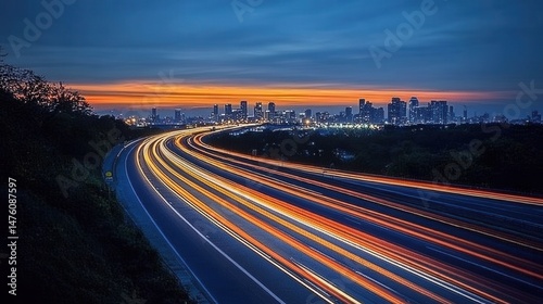 Cityscape at Dusk Highway Light Trails and Urban Skyline