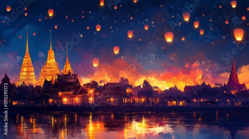 Cityscape at night with glowing buildings lanterns and water reflections.