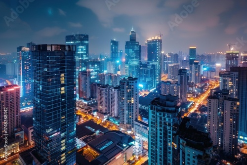 Cityscape at night with illuminated skyscrapers and traffic flowing on streets below