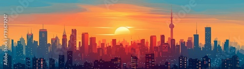 Cityscape at sunset with a blue and orange sky.