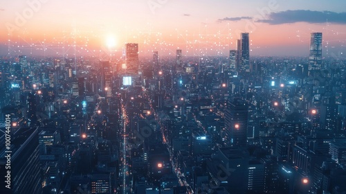 Cityscape at Sunset with Connected Network