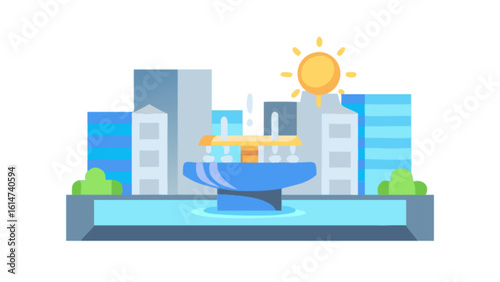 Cityscape fountain vector illustration with buildings and sun for urban design and creative projects use
