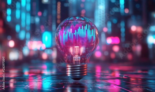 Cityscape night, glowing lightbulb, financial data, innovation concept, website banner