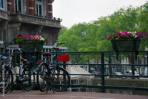 Cityscape of Amsterdam. Bicycle and flowers. Handrail of bridge over canal. Tourism in Europe.