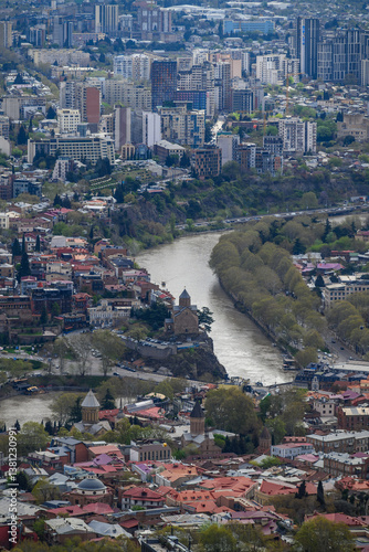 Cityscape of Tbilisi, capital of Georgia, aerial panoramic view from Mtatsminda Park
