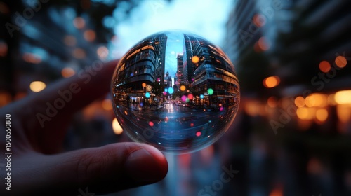 Cityscape Reflected in Crystal Ball Held by Hand at Night
