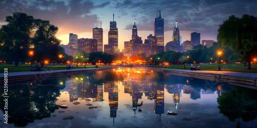 Cityscape Reflects in Calm Waters at Dusk with Illuminated Buildings and Park Benches Tranquilly.