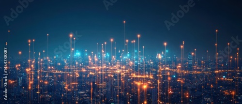 Cityscape shows digital network connecting infrastructure, symbolizing technological advancement and hyper-connectivity.