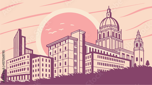 Cityscape silhouette with buildings and dome against a pink sun and sky background design scene view