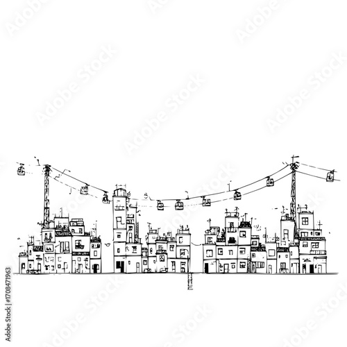 Cityscape sketch drawing vector illustration with cable car line and buildings architecture urban scene art 100