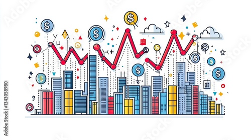 Cityscape with fluctuating economy graph. Stock image showing economic trends