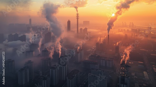 Cityscape with Heavy Air Pollution Smog and Industrial Emissions, Urban Environmental Issues