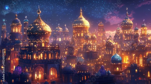 Cityscape with stunning ornate domes and detailed buildings, adorned with radiant diamonds and shimmering jewels