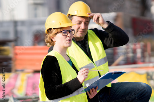 Civil engineers, a man and a woman, wearing safety jackets and helmets, checking projects on construction site