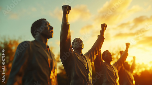 Civil rights monument with raised fists in solidarity, statues standing proudly, golden hour lighting creating an impactful and relevant setting