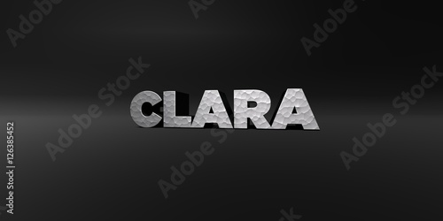 CLARA - hammered metal finish text on black studio - 3D rendered royalty free stock photo. This image can be used for an online website banner ad or a print postcard.
