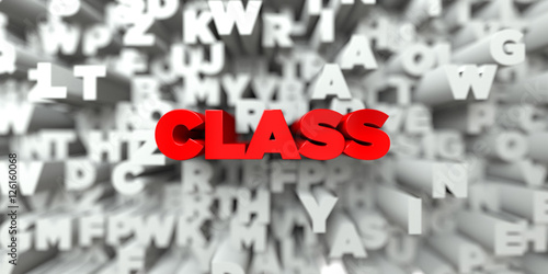 CLASS - Red text on typography background - 3D rendered royalty free stock image. This image can be used for an online website banner ad or a print postcard.