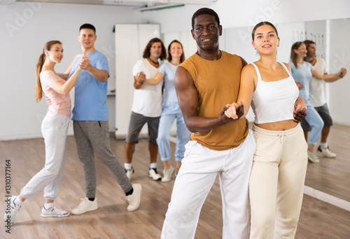 Class of positive multinational couples enjoing partner pair dancing during class together in modern dance hall