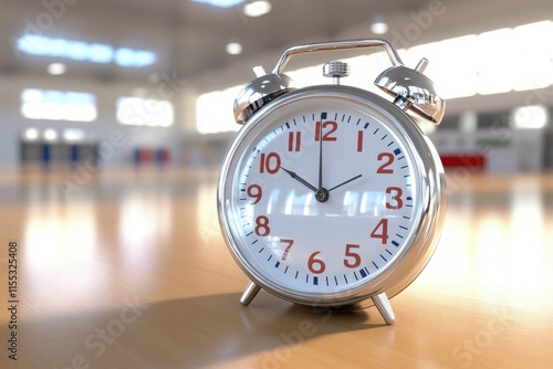 Classic Alarm Clock on Wooden Table in Modern Gym