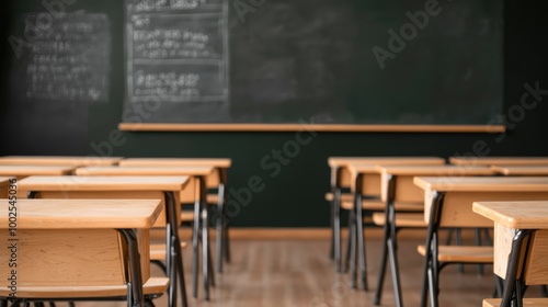 Classic Back to School Setting: Rows of Wooden Chairs and Desks in High School Classroom