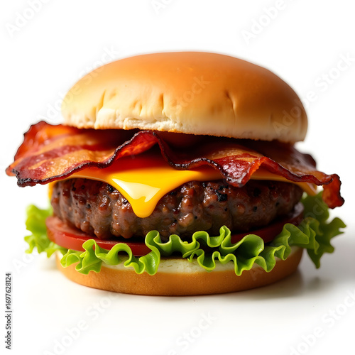 Classic Bacon Cheeseburger with Fresh Lettuce and Tomato, Perfectly Stacked American Cheeseburger with Crispy Bacon, Juicy Beef Burger with Melted Cheese, Bacon, and Fresh Veggies