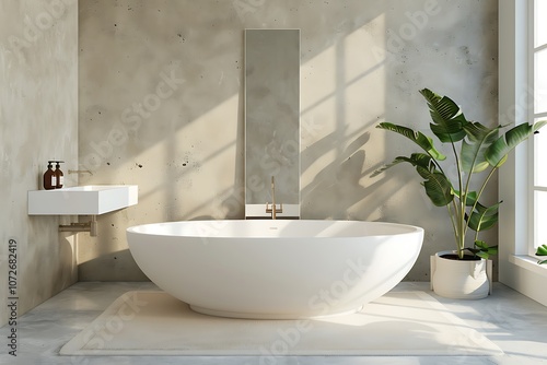 Classic bathroom interior with white bathtub, sink with mirror, beige walls and concrete floor