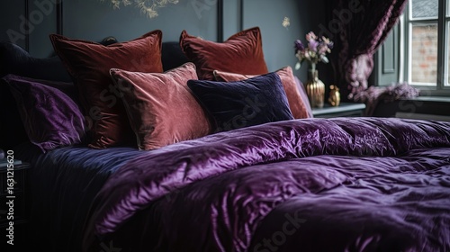 Classic bed setup with a rich purple comforter and velvet throw pillows .