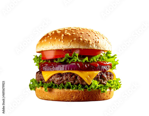 Classic Beef Cheese Burger with Lettuce and Tomato, Wooden Table Background,