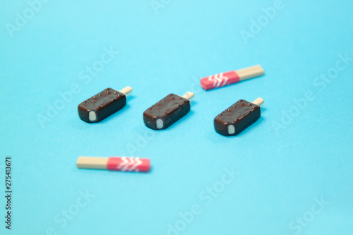 classic bitten popsicles choc-ice Lollipop ice cream in chocolate glaze on blue pastel background