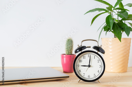Classic black alarm clock, laptop and potted plant on wooden table with white background and copy space