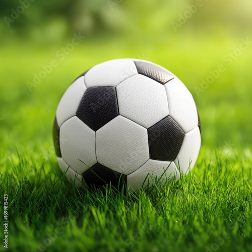 Classic black and white soccer ball resting on vibrant green grass, ready for game day action and outdoor sports fun