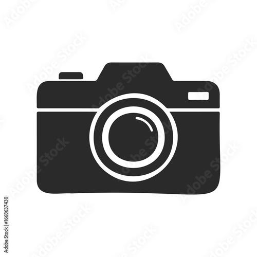 Classic black camera icon with lens on white background