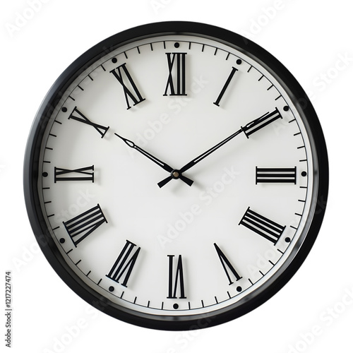 Classic black frame wall clock with roman numerals and white face isolated on a transparent background