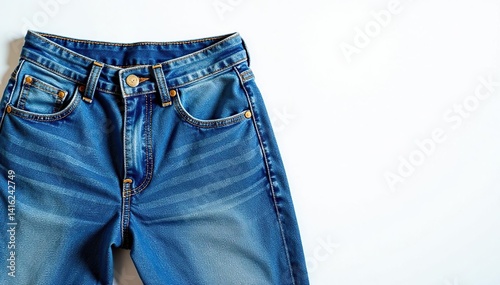 Classic blue denim jeans, crisply folded on white , backdrop, white background, button
