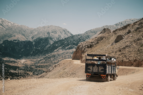 Classic brown big rig semi truck with step down turn on winding road going through the mountains.