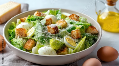Classic Caesar salad with egg, croutons, and Parmesan on a light background