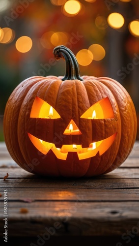 Classic carved Halloween pumpkin glowing warmly in a festive autumn scene. Cozy seasonal phone wallpaper. Generative AI.
