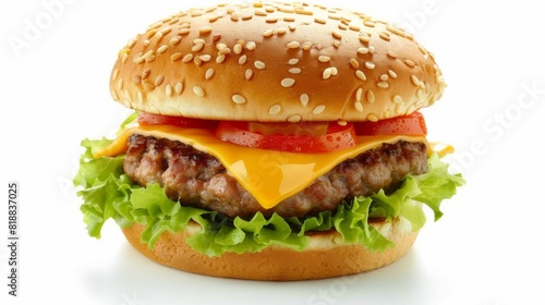 Classic cheeseburger with juicy patty, melted cheese, lettuce, and tomato on a sesame seed bun