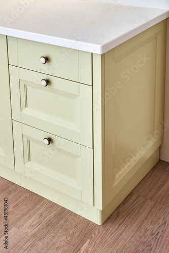 Classic chest of drawers with light green facades and acrylic solid surface countertop in light modern kitchen close view