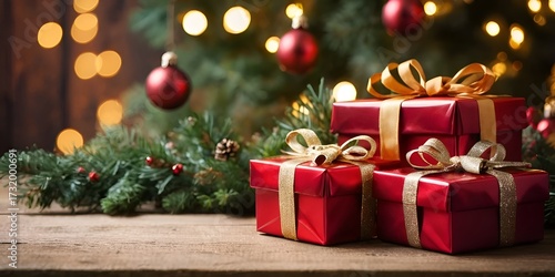 Classic Christmas Cheer: Traditional Red and Gold Presents on Rustic Wood with Fir Branches