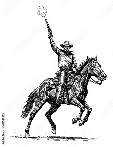 Classic Cowboy Riding Galloping Horse Holding Gun Up Firing Smoke in Black and White Outline Line Art Drawing