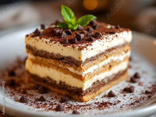 Classic delicious tiramisu dessert with mint on top