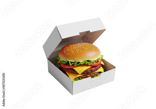 Classic double beef burger with melted cheese and fresh vegetables served in an open, plain white cardboard box for delivery or takeout