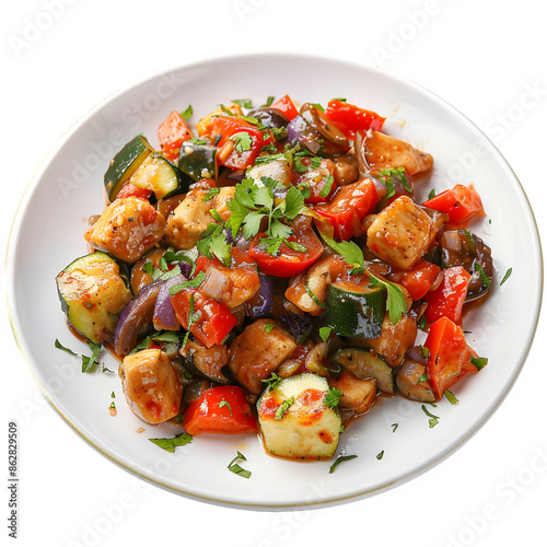 Classic french ratatouille presented in a white dish, set against a clear backdrop