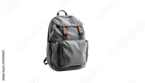 Classic gray canvas backpack, sturdy design, multiple pockets, isolated on white background, texture, zipper